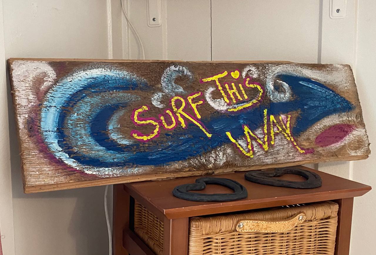 „surf this way“ ist ein Geschenk an mein Kind und dient als Inspiration, was in meiner Werkstatt weiteres in Bearbeitung ist: Bemalen alter Holzbretter mit Sprüchen die mir gefallen.